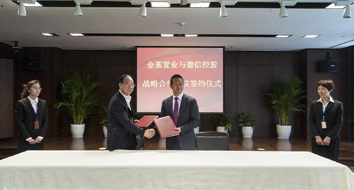 德信控股集团与金基置业日前在杭州明珠国际商务中心签署了战略合作协议,德信控股集团董事长胡一平、常务副总裁费中敏,金基置业董事长徐正库、总经理钱文海等领导班子参加了签约仪式。