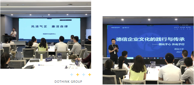 主题分享让学员们快速进入学习的氛围。为了让学员加深对公司和项目的了解,传递企业文化和公司导向,德信产商文集团人力行政中心总经理陈江钱给大家分享了《德信产商文集团发展战略》与《德信集团企业文化》。同时为了强调三正文化,做廉洁自律的德信人,德信地产集团审计监察中心监察总监薛海波针对《德信集团审计监察宣贯》进行了主题授课。干货满满的课程分享,助力大家能够更好地融入德信、学在德信。