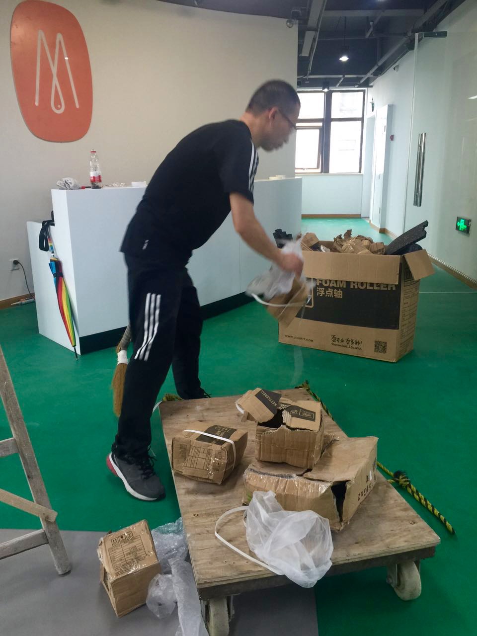 工欲善其事必先利其器,为了逗伴酱们有一个更好的运动体验,无论从运动场馆的舒适度到运动器械和数量功能都是磨豆士们最为重视的,操心的他们全员出动亲自进行器械入场以及打扫清洁。
