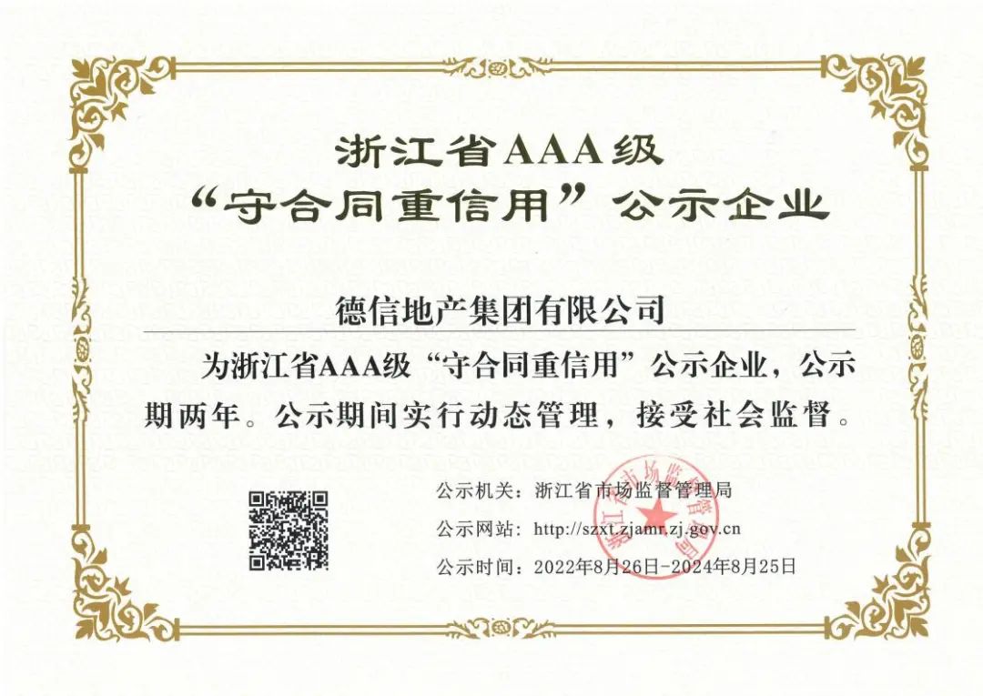 近日,2022 年浙江省 AAA 级“守合同重信用”企业评定结果新鲜出炉,经企业申报、各级审核、省局办公会议研究,德信地产集团有限公司入选2022 年浙江省 AAA 级 “守合同重信用”企业。荣誉是激励,更是责任和鞭策。未来,德信地产将继续强化“契约”精神,诚信经营,为促进社会诚信体系建设,创造良好的市场经济秩序,推进浙江省经济高质量发展作出新贡献。
