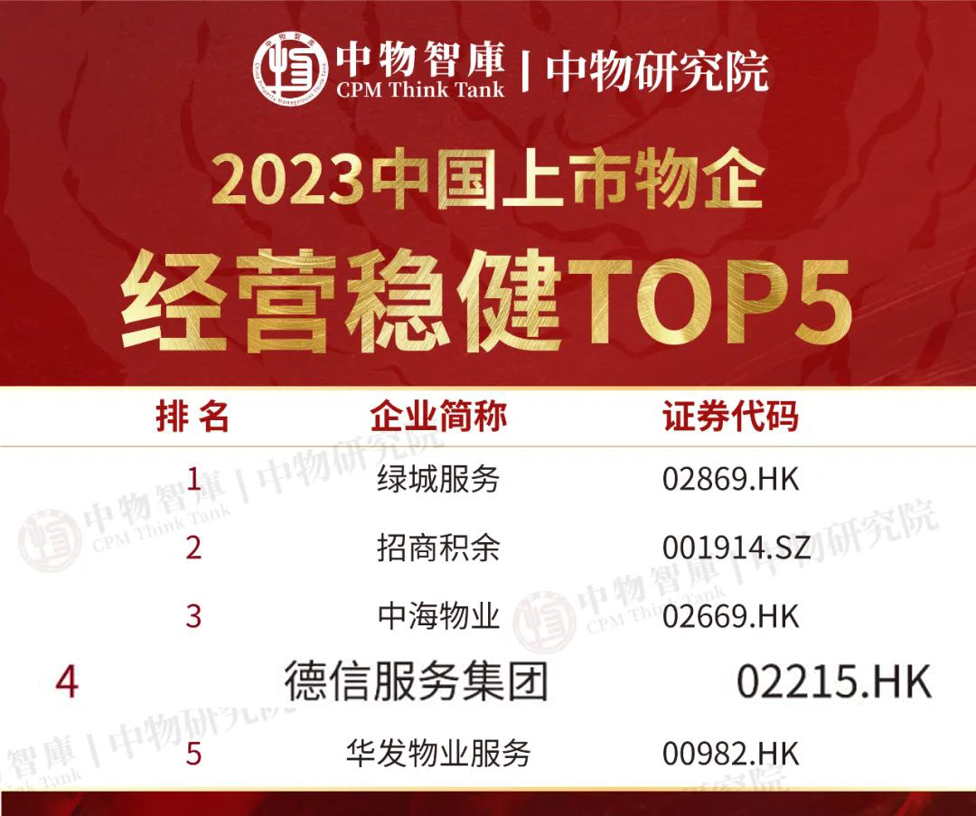 5月10日,中物智库、中物研究院重磅发布《2023中国物业管理行业上市物企测评研究报告》。德信服务,凭借知己特色的温情服务与稳健的企业运营成绩备受认可,成功入选“中国上市物企企业稳健经营TOP5”。 同时,凭借在碳中和领域与可持续发展领域的持续深耕,德信服务本次成功获评“中国上市物企最佳ESG实践”。